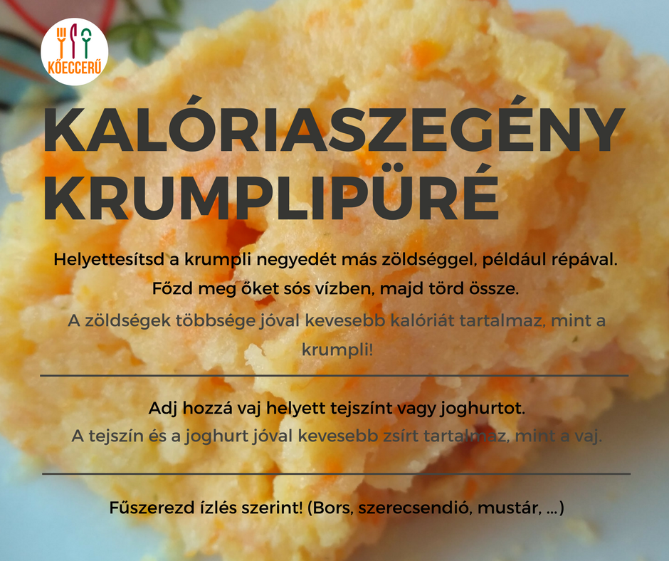 1. Helyettesítsd a krumpli negyedét más zöldségekkel! A répa például kevesebb, mint fele annyi kalóriát tartalmaz, mint a krumpli. Főzd meg őket sós vízben. A vizet lecsöpögtetve törd össze őket. 2. Adj hozzá vaj helyett tejszínt vagy joghurtot! A vaj kb 80%-ban tartalmaz zsírokat (és több,mont 700 kalória), míg a házi tejszín kb 40%-ban (és kb 345 kalória). A boltokban általában 10%-os és 20%-os tejszínt tudsz venni. A házi joghurt kb 3.5% zsírt tartalmaz (és kb. 60 kalóriát), a boltiak általában ennél kevesebbet.